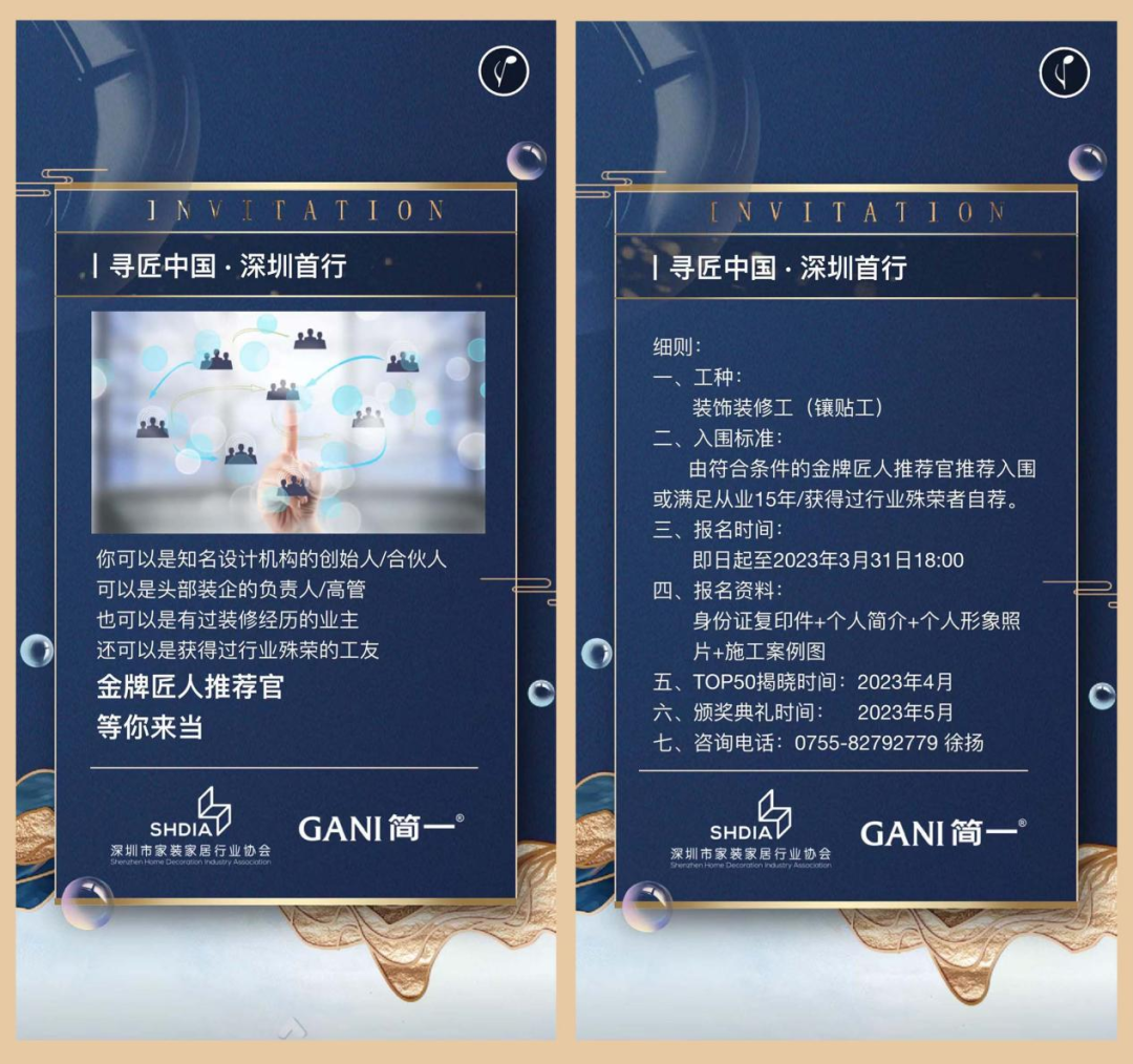 協會和GANI簡一再次攜手,共舉行業工匠大旗,用五十枚純金勛章尋找五十位匠人。本次匠人的入圍將由知名設計機構的創始人/合伙人;頭部裝企的負責人/高管;有過裝修經歷的業主;獲得過行業殊榮的工友擔任金牌匠人推薦官,推薦匠人入圍。或滿足從業15年/獲得過行業殊榮者自薦入圍。報名資料須提供身份證復印件+個人簡介+個人形象照片+施工案例圖。報名時間為即日起至2023年3月31日。