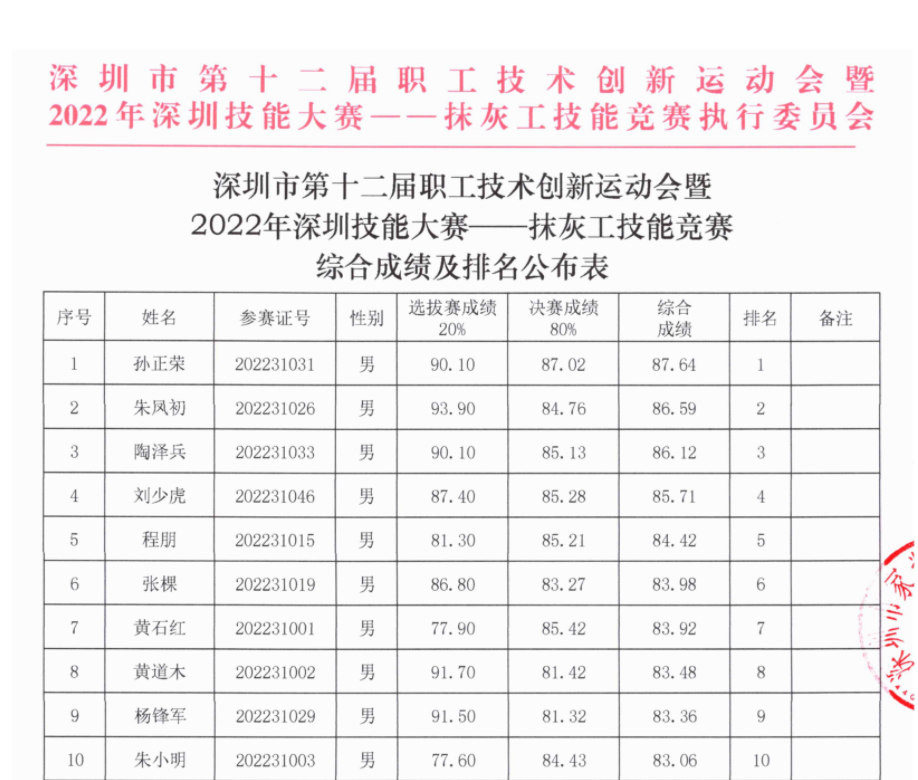 10月30日,由深圳市總工會、深圳市人力資源和社會保障局主辦,由深圳市家裝家居行業協會、深圳市羅湖區筍崗街道總工會、深圳市羅湖區筍崗街道家裝家居行業工會聯合會承辦,由北站N空間、虹運倉配、卓邦、可耐福、金瓜子、居眾、名雕、浩天、金紫荊、好易家、領航、譽家、國安居、永安、家裝先生、巴比兔支持的深圳市第十二屆職工技術創新運動會暨2022年深圳技能大賽——抹灰工技能競賽,在深圳北站東廣場97觀景平臺成功舉辦。