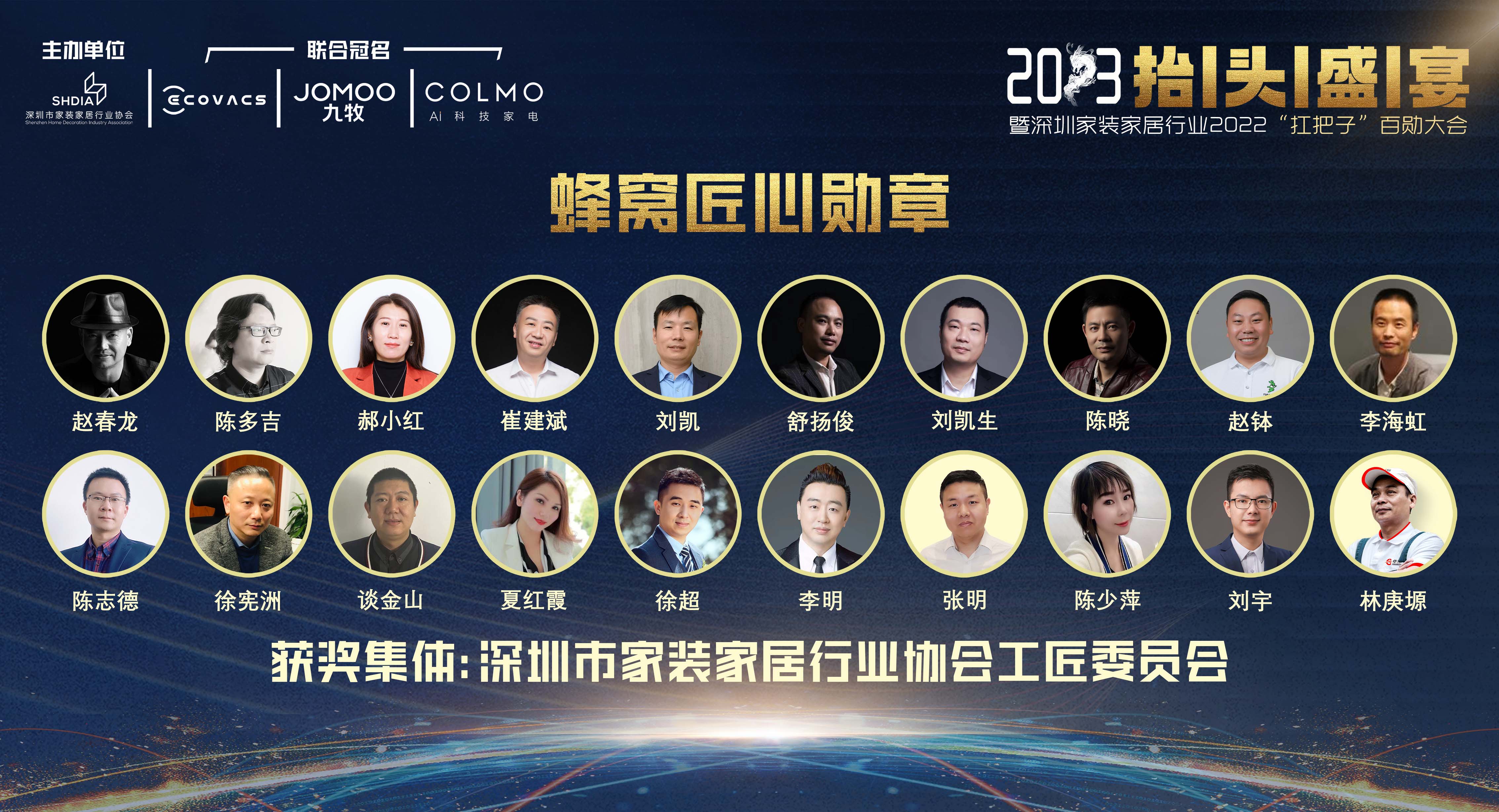 這一年,市場在各方壓力下艱難前行,面對有些著急、浮躁的市場心態,有一群人不為所動,堅持匠心,為行業良心堅守市場。獲得2022年度深圳家裝家居行業“扛把子”蜂窩匠心勛章的20位企業家,分別是: