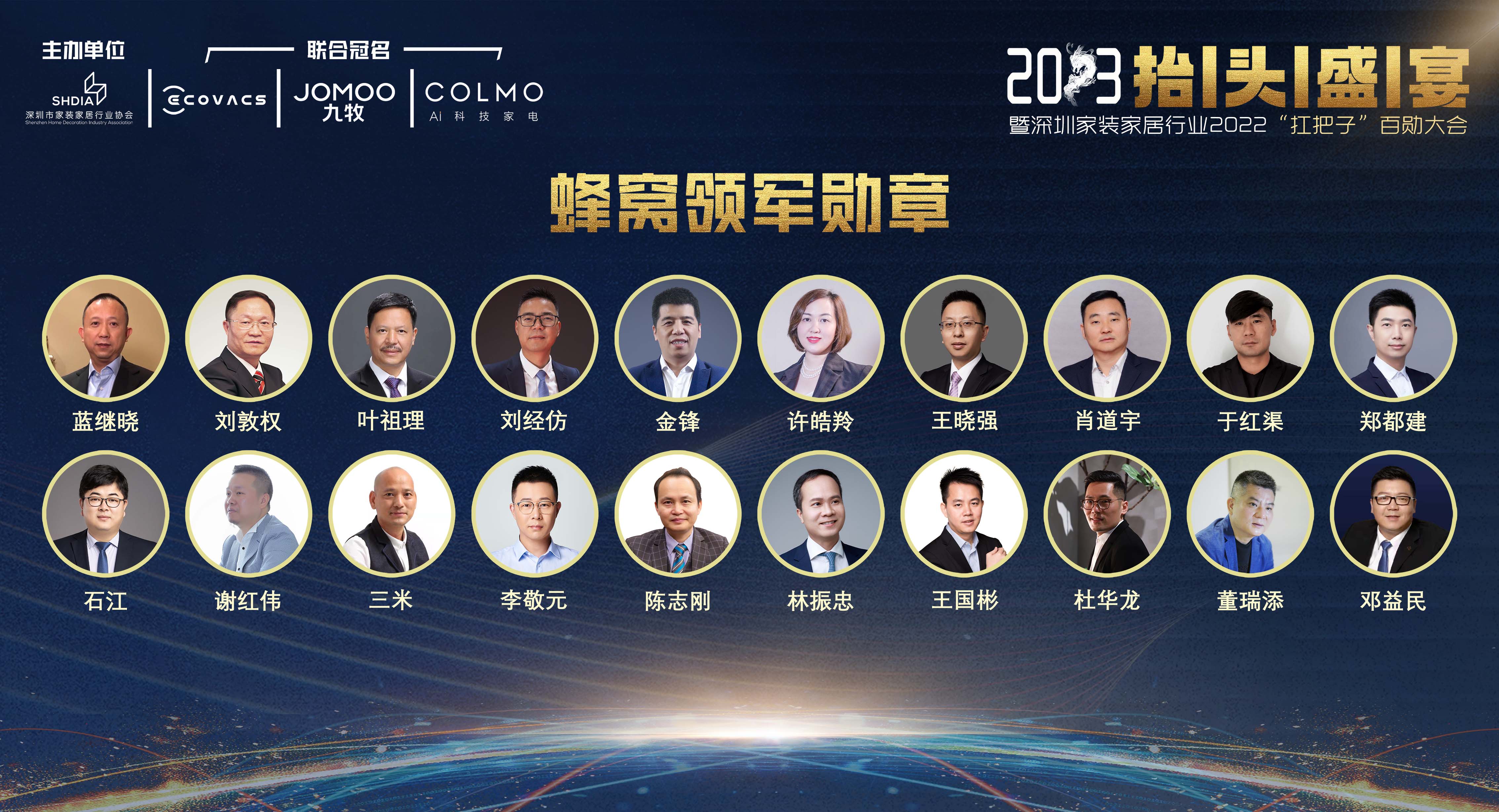 這一年,市場遭遇接二連三的打擊,行業面臨極大的沖擊,有一群人臨危不亂,撥云見日,為行業穩定做出了卓越的貢獻。獲得2022年度深圳家裝家居行業“扛把子”蜂窩領軍勛章的20位企業家,分別是:
