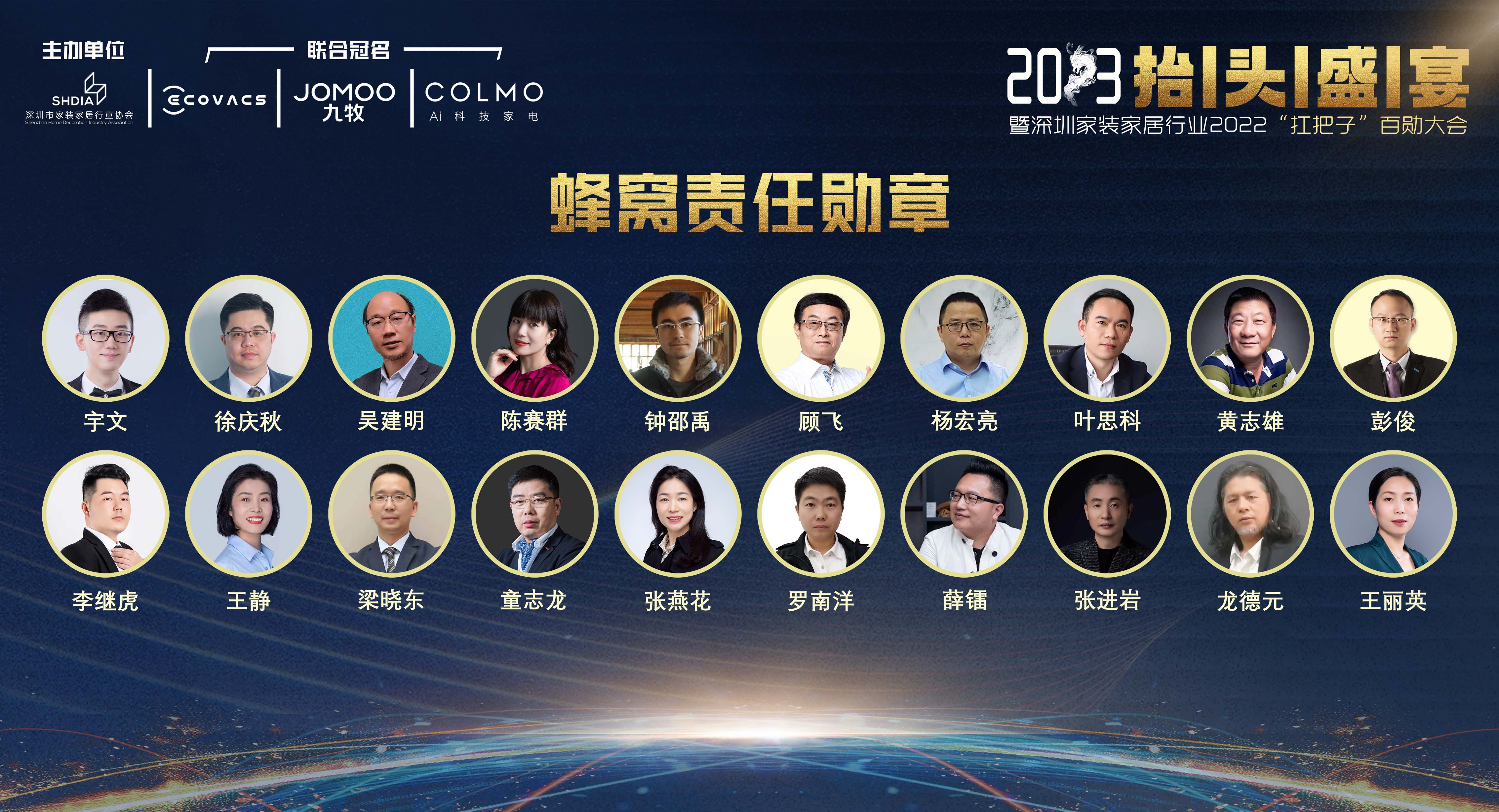這一年,市場遭遇接二連三的打擊,行業面臨極大的沖擊,有一群人勇于擔當,承攬責任,為行業穩定發展盡到了應有的責任。獲得2022年度深圳家裝家居行業“扛把子”蜂窩責任勛章的20位企業家,分別是: