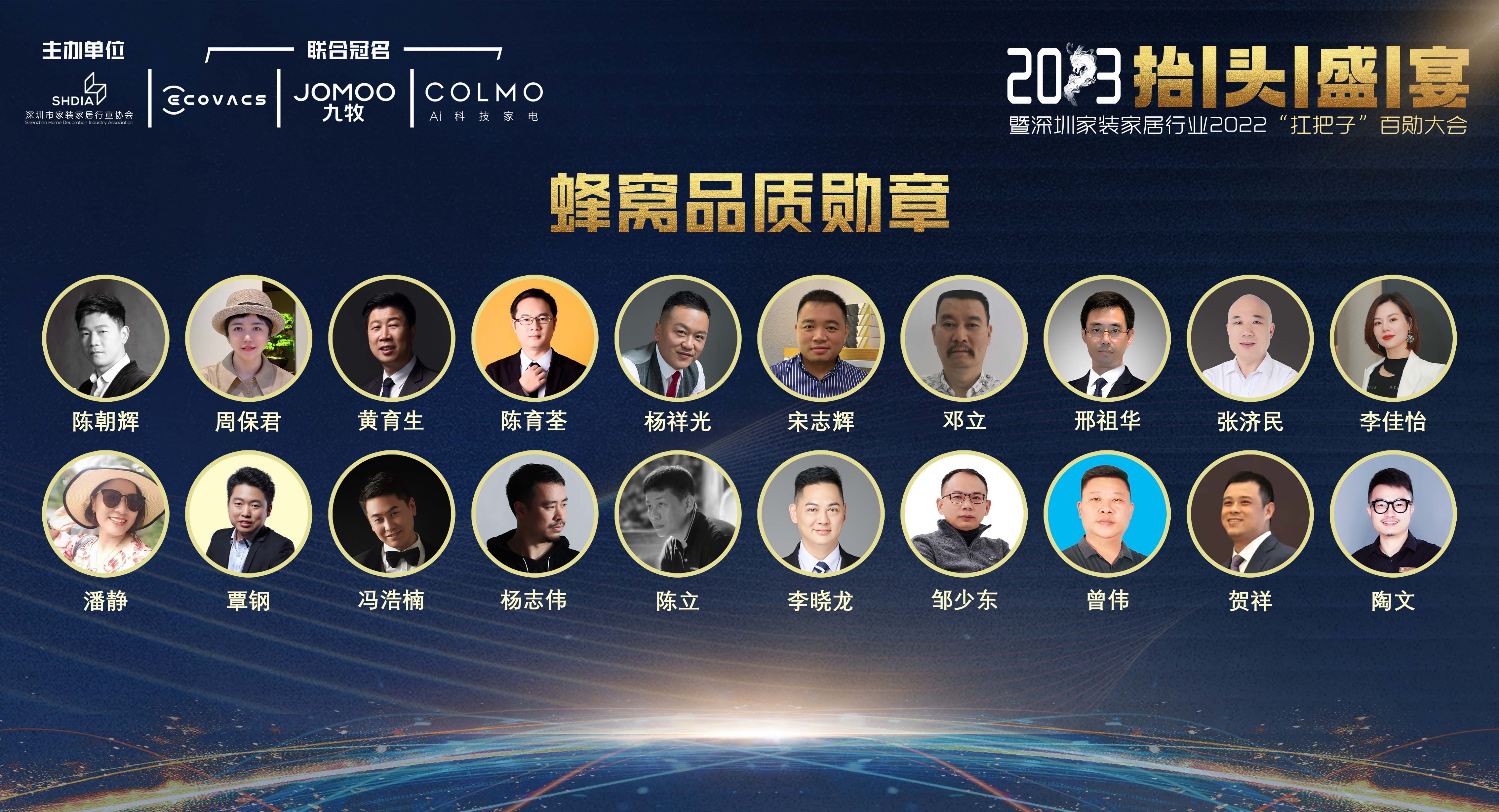 品質是行業的生命,這一年,不管市場有多難,有一群人總在跟品質較勁,用出品為行業贏得認可和價值,為行業發展做出了重要貢獻。獲得2022年度深圳家裝家居行業“扛把子”蜂窩品質勛章的20位企業家,分別是: