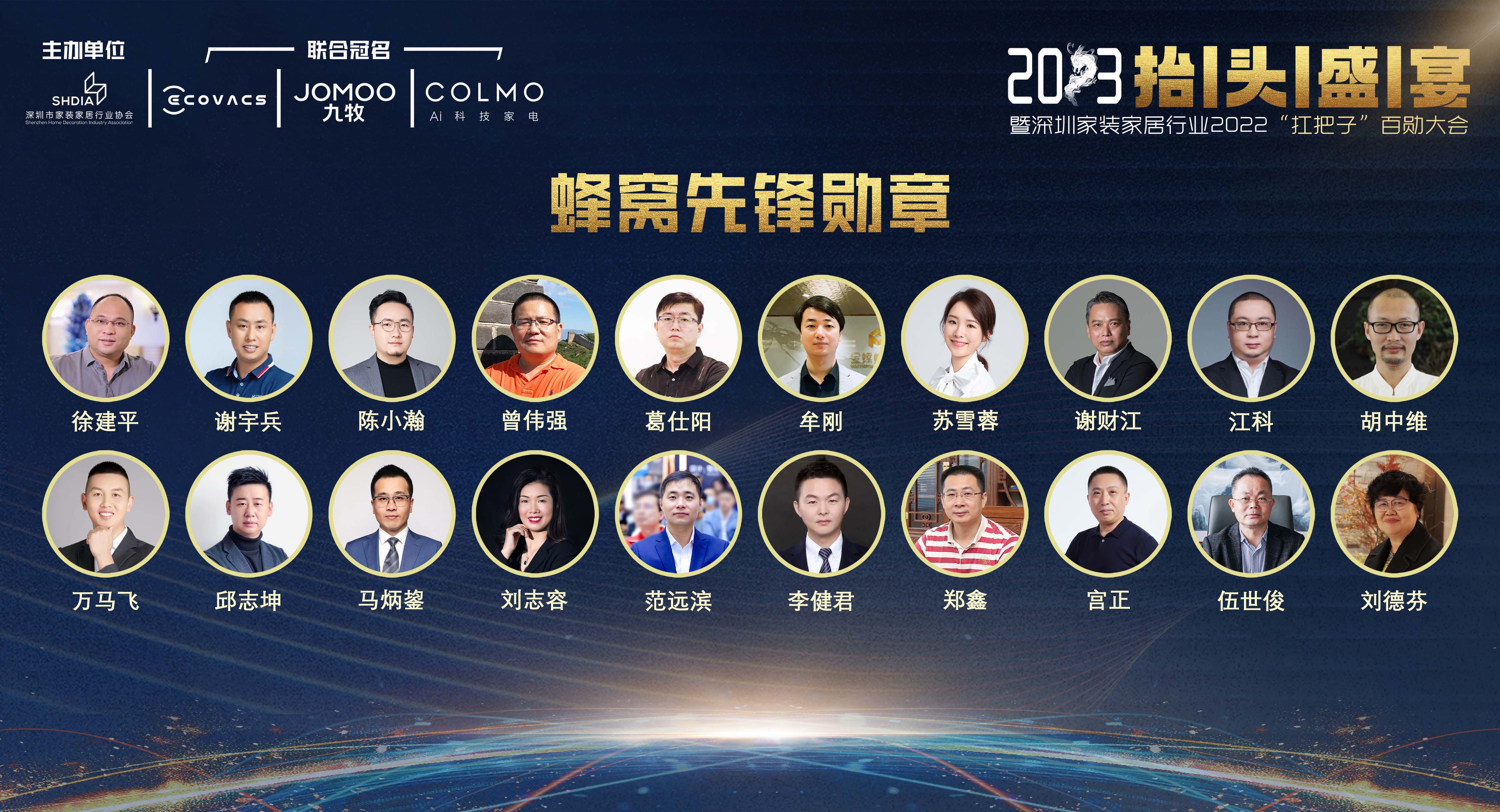 這一年,市場遭遇前所未有的困境,行業士氣遭遇極大的挑戰,有一群人身先士卒,沖鋒陷陣,成為行業發展的先鋒和表率。獲得2022年度深圳家裝家居行業“扛把子”蜂窩先鋒勛章的20位企業家,分別是: